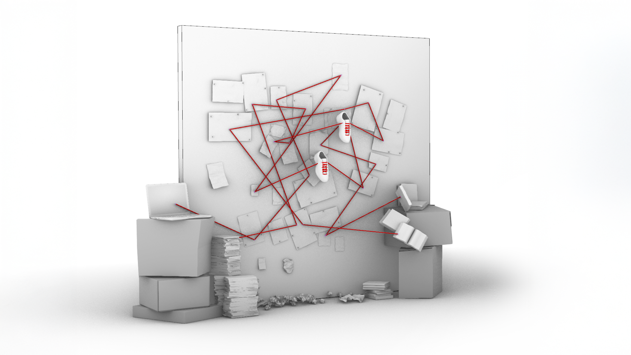 In the early stages of a project to present the benefits of a training platform in development at Nike, as a quick way to grab our audience’s attention while communicating the need for the platform, I proposed a mixed sculptural installation concept that would immediately register as the chaotic search through conventional resources to find a personalized training plan.